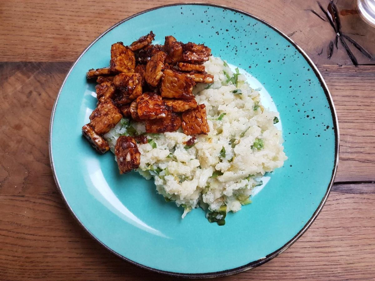 - Verdeel de stamppot over 2 borden en verdeel de tempé hierover