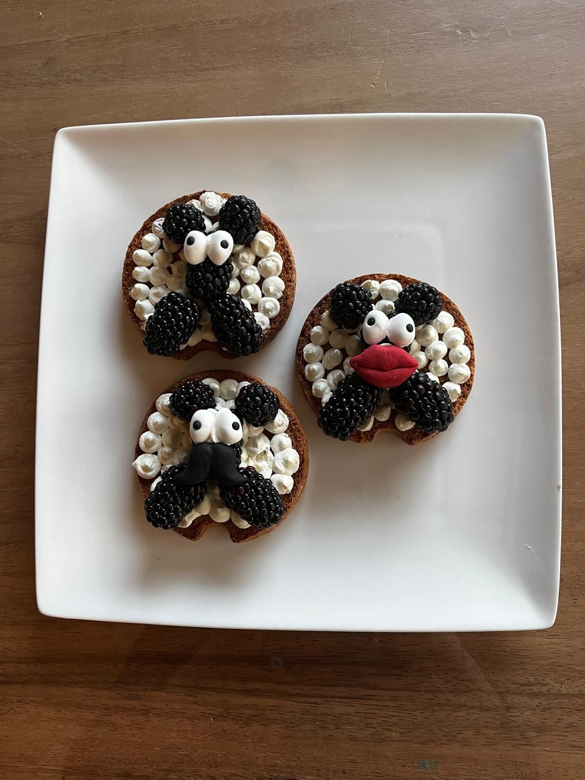 - Snijd de rest van de bramen doormidden en maak er pootjes en oortjes van.