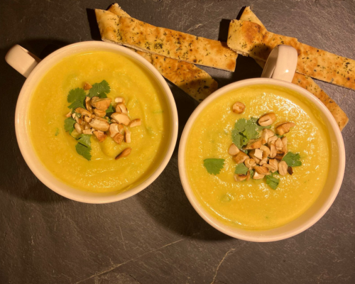 - Verdeel de soep over de borden en garneer met de koriander en de gehakte cashewnoten.