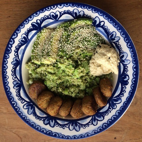 - Serveer de broccoli, couscous, falafel, hummus en avocado in kommen als een maaltijdbowl.
