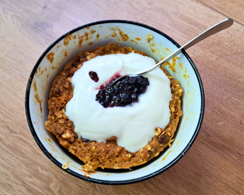Top hem af met yoghurt, en eventueel nog wat vers fruit, noten en zaden of zoals ik deed met een schepje bosbessen jam