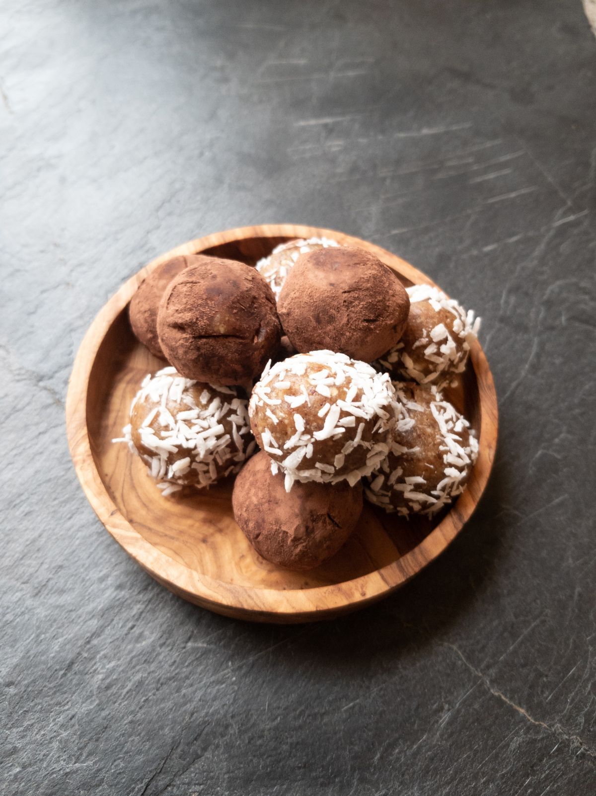- Strooi het kokosschaafsel in een bord en rol de helft van de balletjes erdoor tot ze volledig bedekt zijn.
