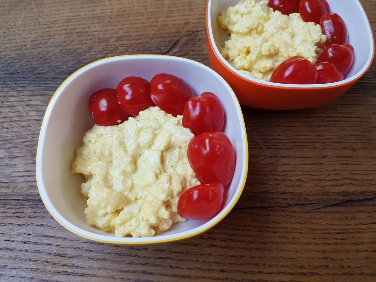 - Meng de stukjes ei door het mayonaise-mengsel en verdeel in 2 porties en garneer die met wat snoeptomaatjes