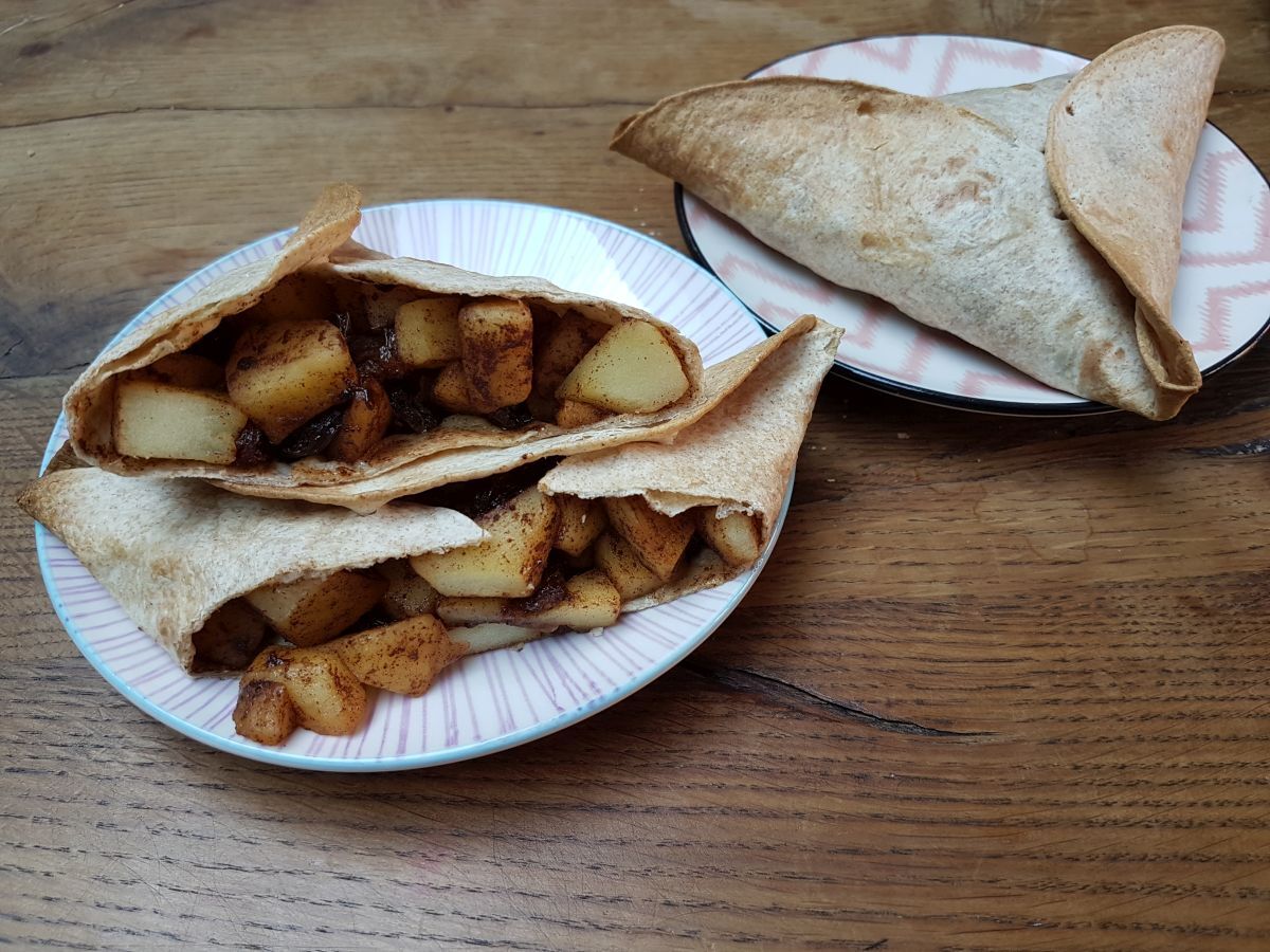 - Vouw de wraps in een driehoek dicht (zie foto) en zet ze eventueel vast met cocktailprikkers