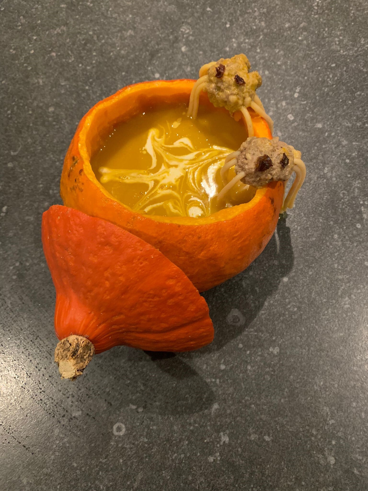 - Schep de soep in de pompoenschil en spuit een spinnenweb van crème fraîche op de soep