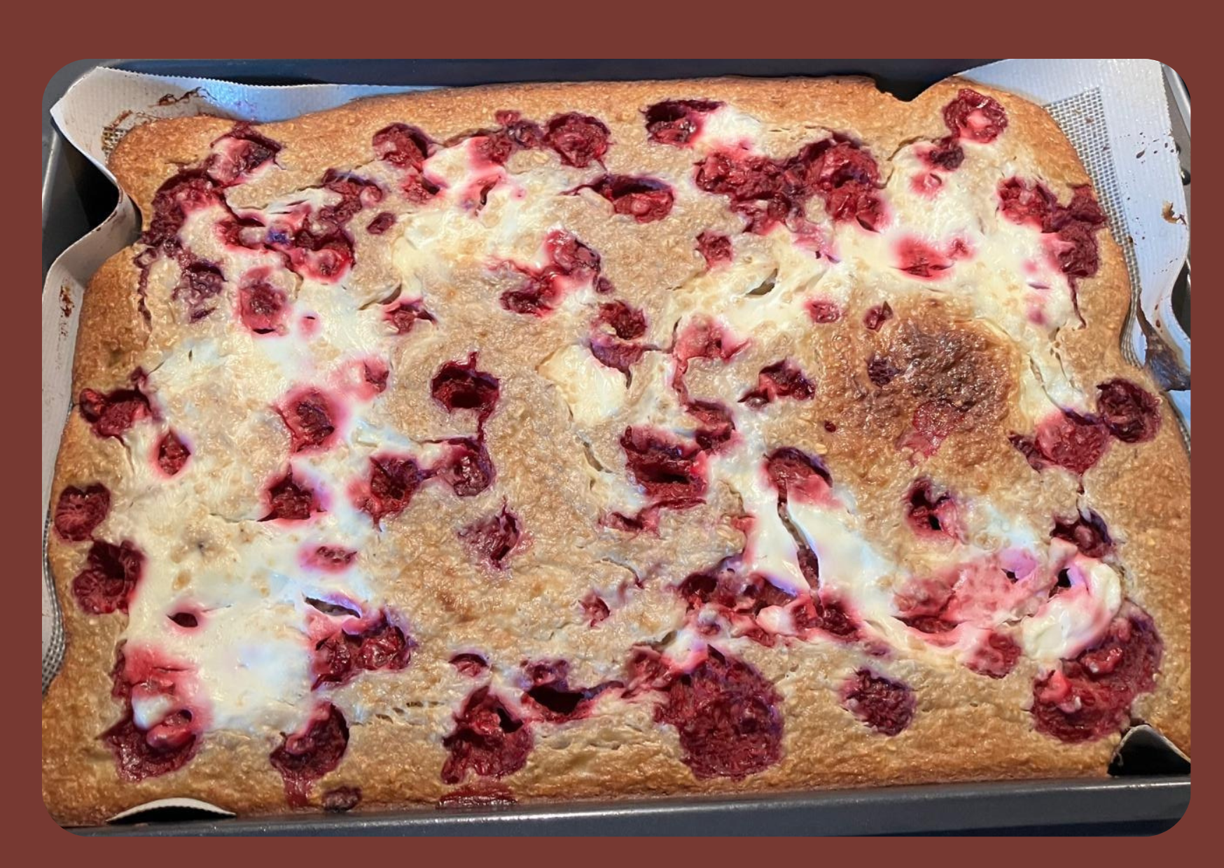 - Verdeel de frambozen over het mengsel (ik heb ze heel gelaten in het originele recept werden ze verwarmd en meer tot een massa gemaakt)