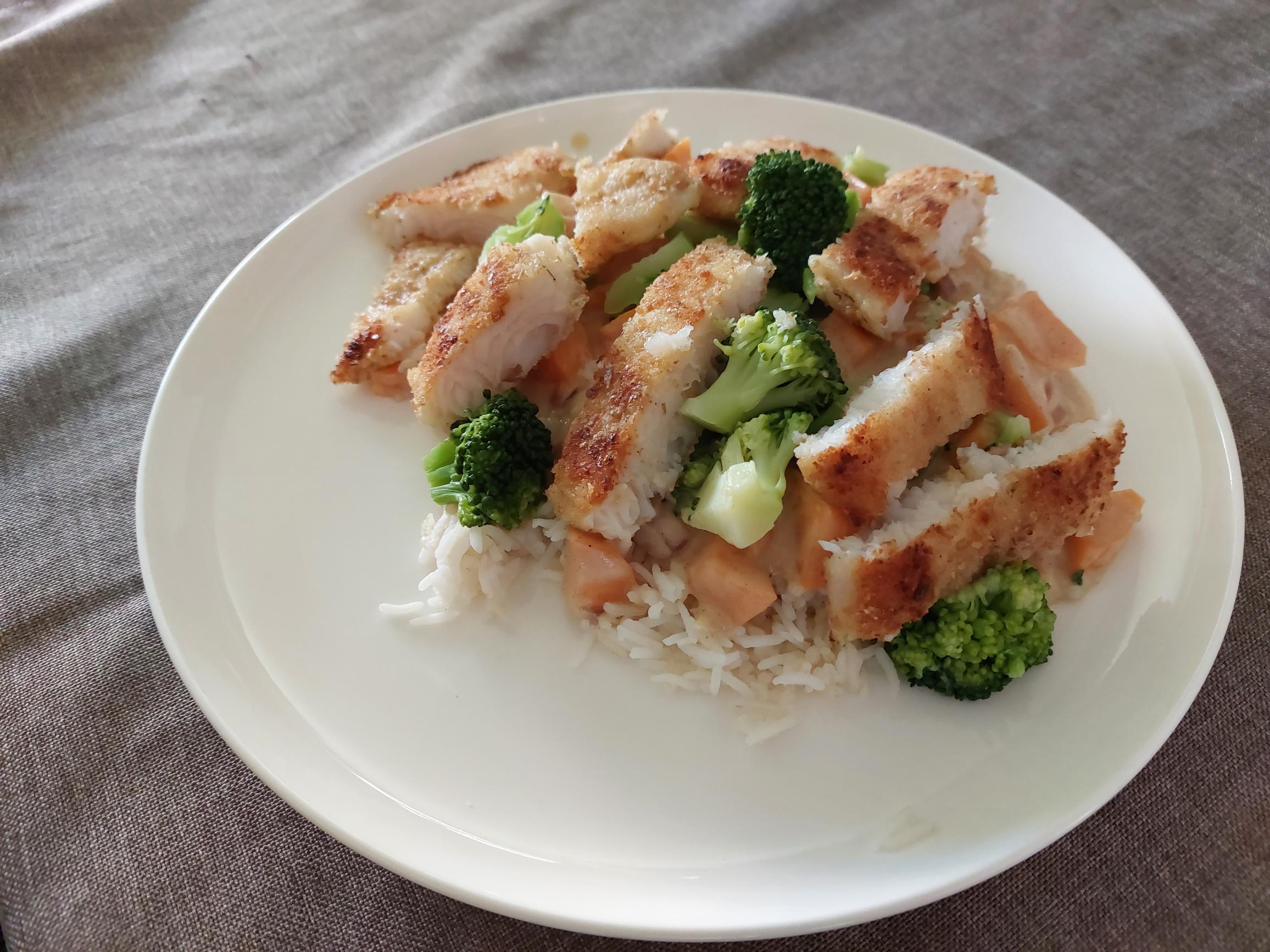 - Verdeel de rijst over de borden, leg de visreepjes erop en schep er wat currysaus overheen. Serveer met de broccoli en de rest van de saus
