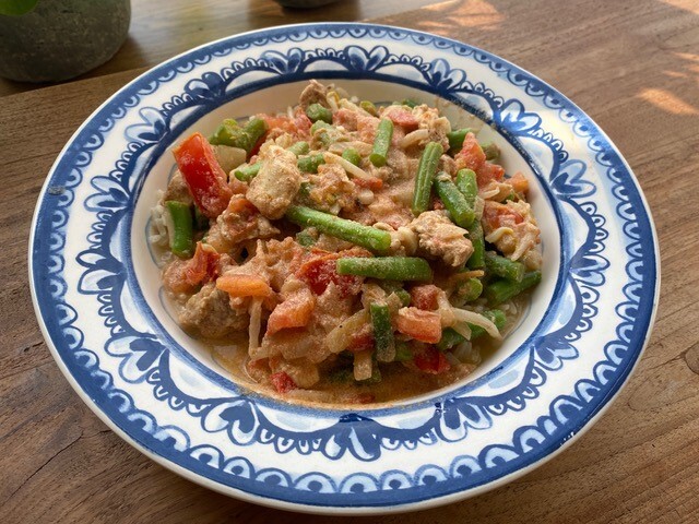 - Doe een deksel op de pan, draai het vuur lager, en voeg wanneer de kip en sperziebonen bijna gaar zijn, de taugé toe. Laat dit pruttelen tot de curry gaar is