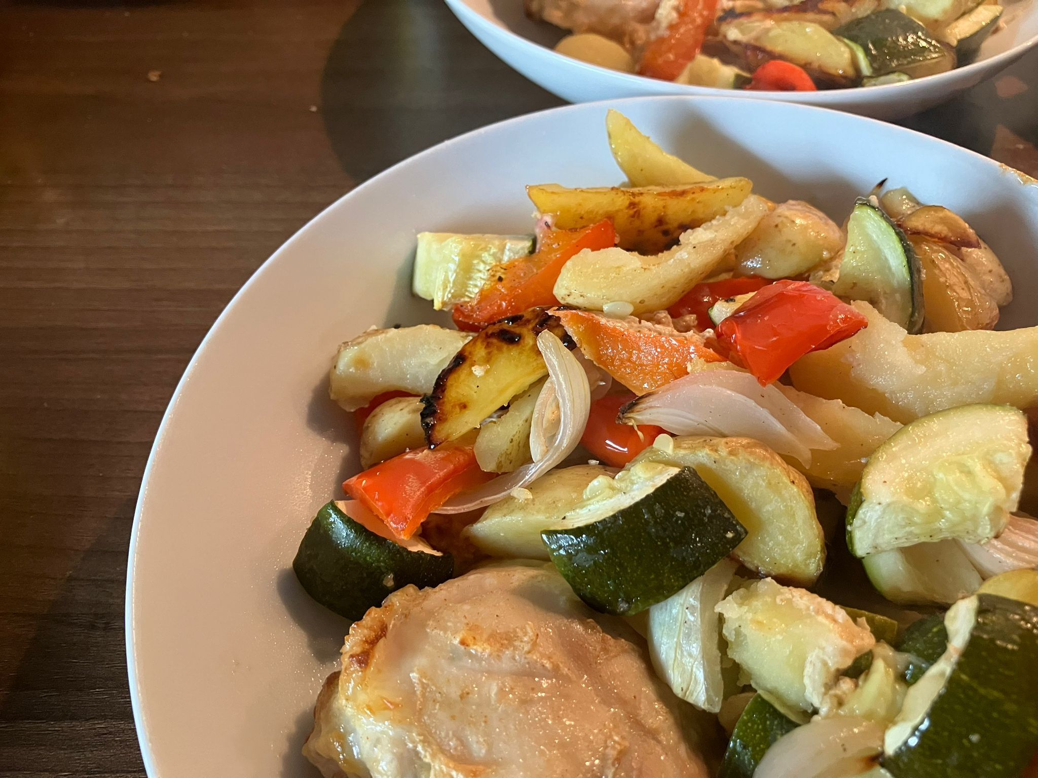 - Leg de kippendijstukje met aanhangende yoghurt bovenop de groente