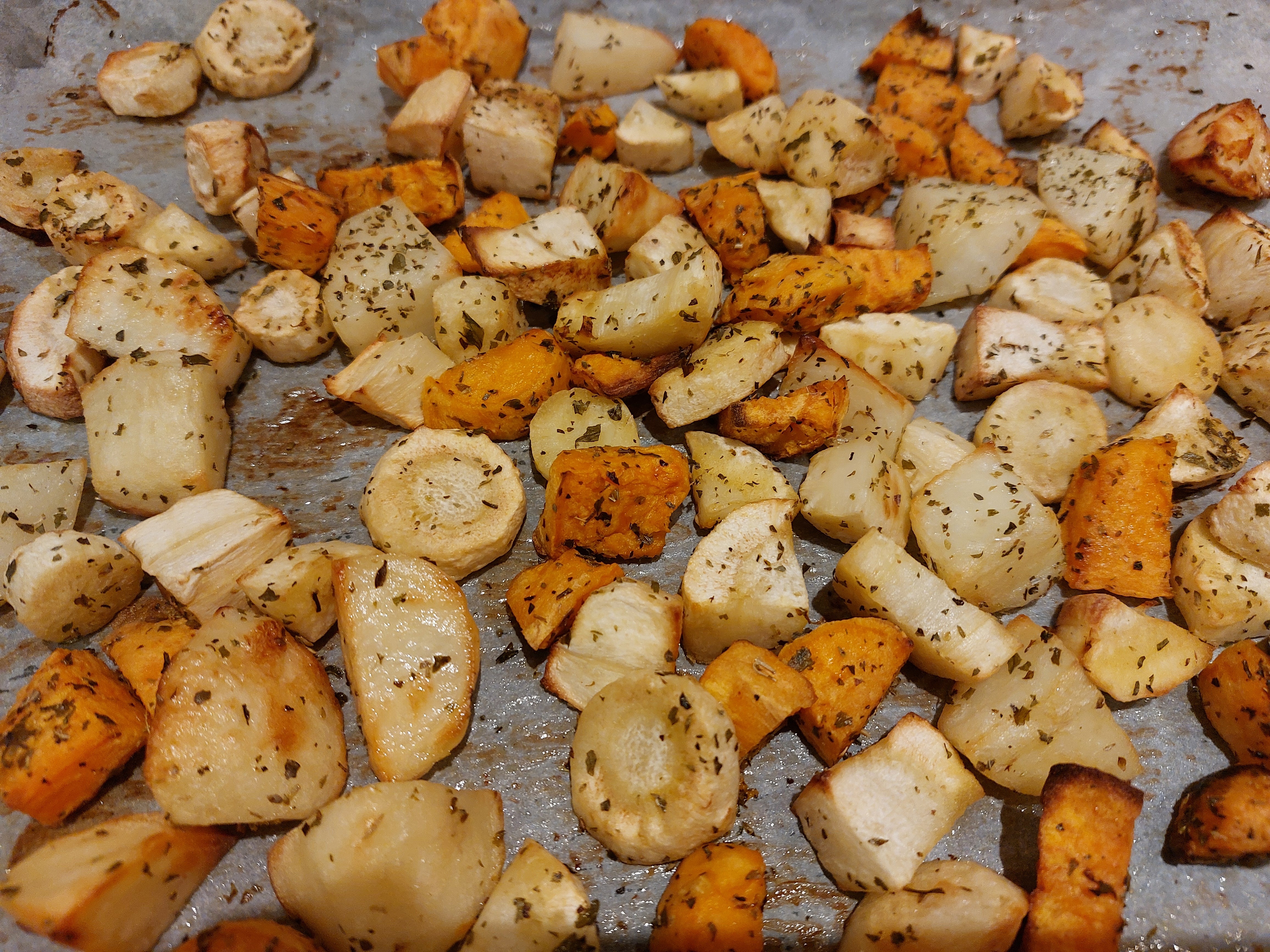 Zo simpel kan koken zijn: je snijdt wat groenten, legt het op een bakplaat en de oven doet de rest. Zoete aardappel en pastinaak worden door de bereiding in de oven nog zoeter van smaak! Pastinaak is een echte herfstgroente en hoort tot de knolgewassen. Wel even geduld hebben in de oven, maar op een druilerige dag waarop ik (Maureen) het maakte is dat niet erg. Ik was alleen de verse rozemarijn vergeten te kopen, maar oregano en peterselie volstaan ook.