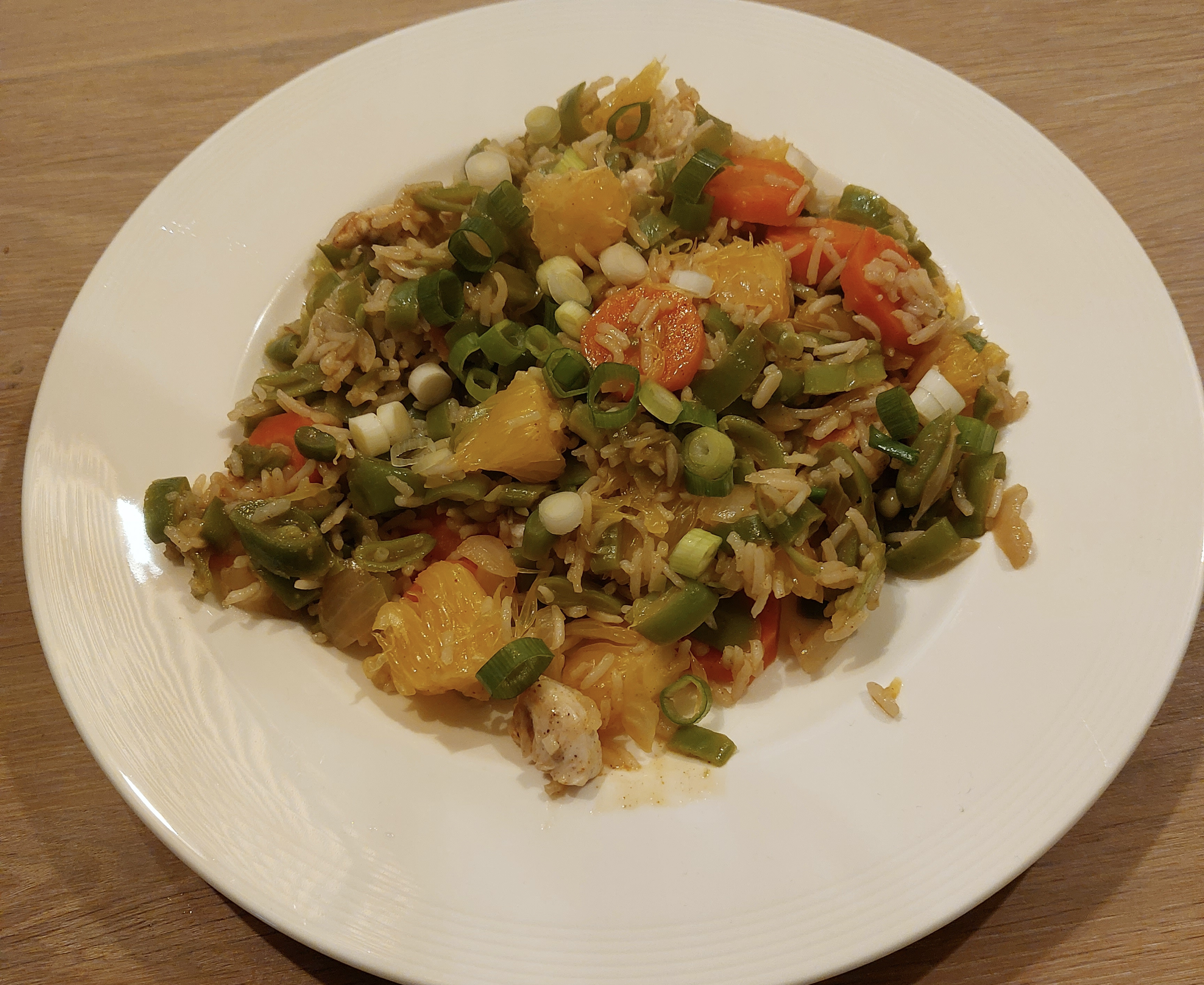 - Meng sinaasappel en kalkoen door het mengsel en warm alles goed door