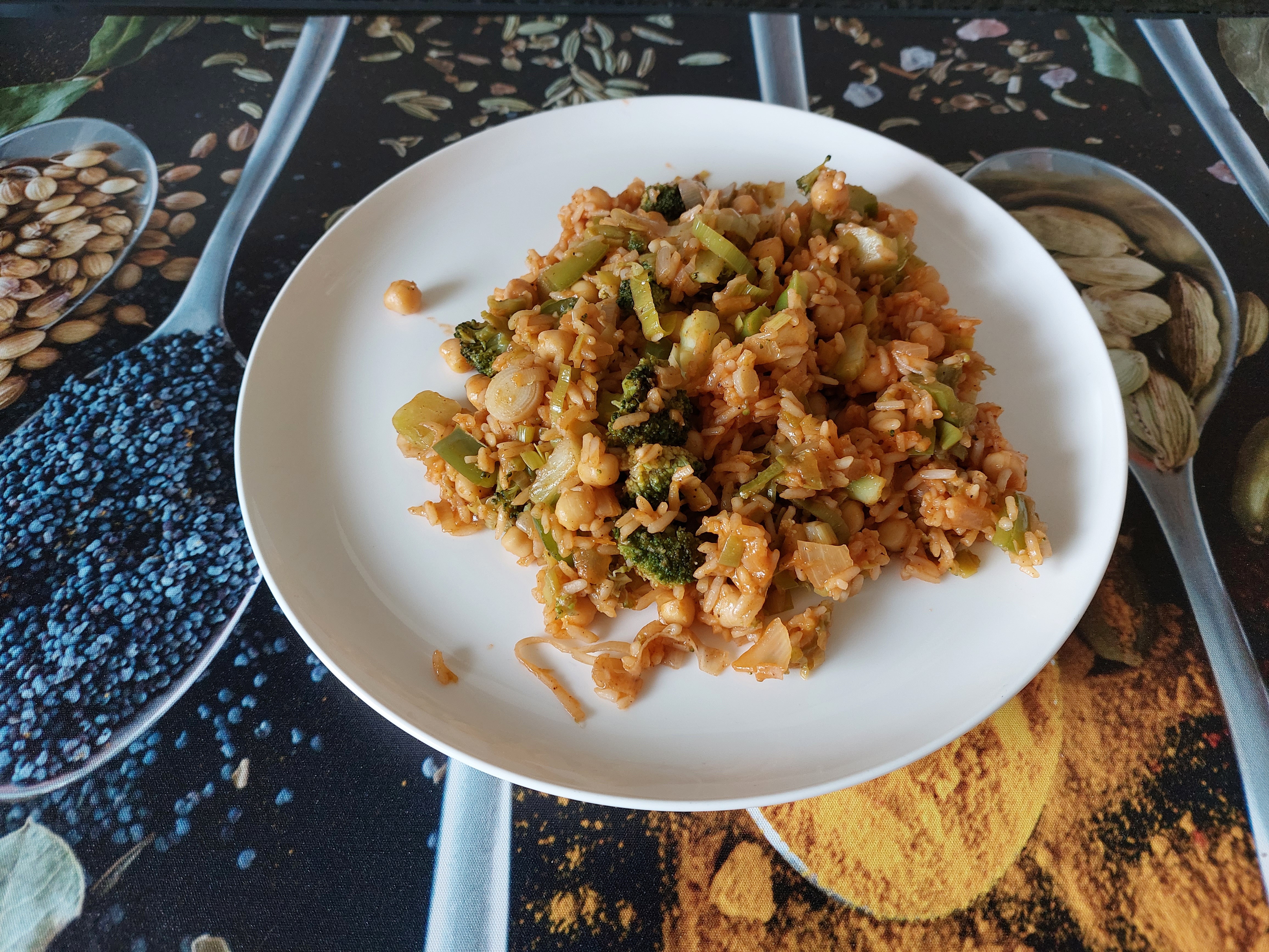 - Meng de groente en de kikkererwten door de rijst en warm het geheel goed door.