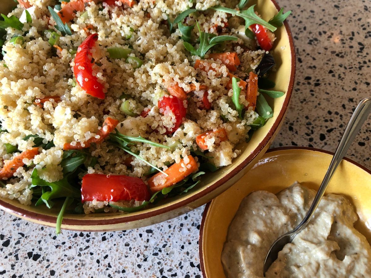 Pas geleden had ik (Martine) een online vergadering van de vereniging van sportdiëtisten waar ik bij aangesloten ben. Als afsluiting werd er een ontzettend leuke online kookworkshop georganiseerd. Vooraf kregen we een boodschappenlijstje en alle sportdiëtisten stonden met hun laptop in hun eigen keuken mee te koken met Janneke Pieterson sportdiëtist, sportdocent en chefkok voor verschillende teams met haar eigen bedrijf Sportkeuken. Wat een leuke manier om samen aan de slag te gaan! Deze quinoa-salade houd ik er in ieder geval in!