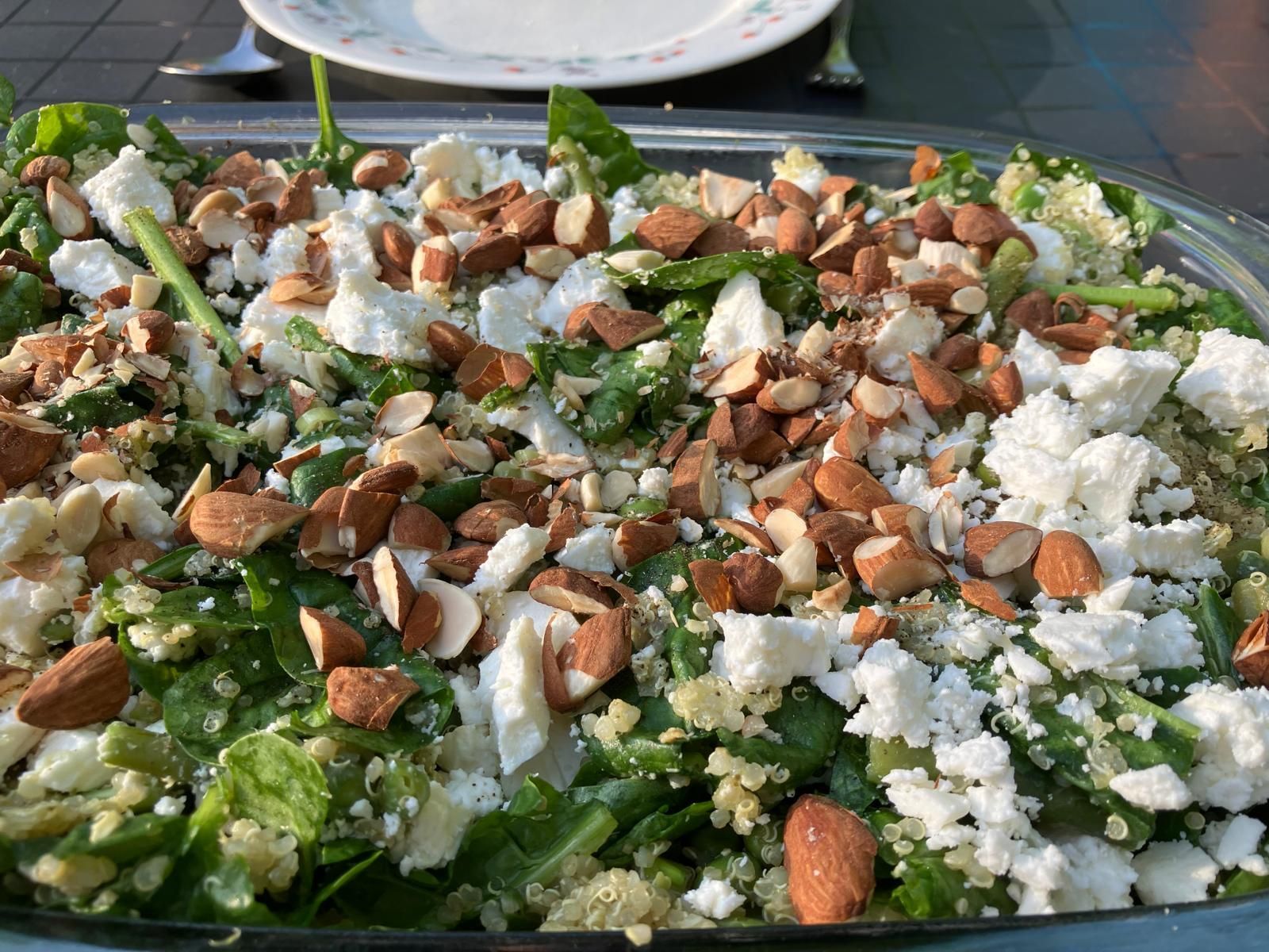 De inspiratie voor deze salade vond ik op internet. In het recept werden groene asperges gebruikt maar die waren de eerste keer dat ik hem maakte niet voorradig, toen heb ik in plaats van asperges snijbonen uit de diepvries gebruikt. Voordeliger en heel makkelijk en lekker. Een volgende keer heb ik hem wel met asperges gemaakt en dat was ook zeker heerlijk. Voor de smaak en een beetje crunch heb ik wat gerookte amandelen toegevoegd. En ik heb natuurlijk weer wat meer groente gebruikt dan in het oorspronkelijke recept.