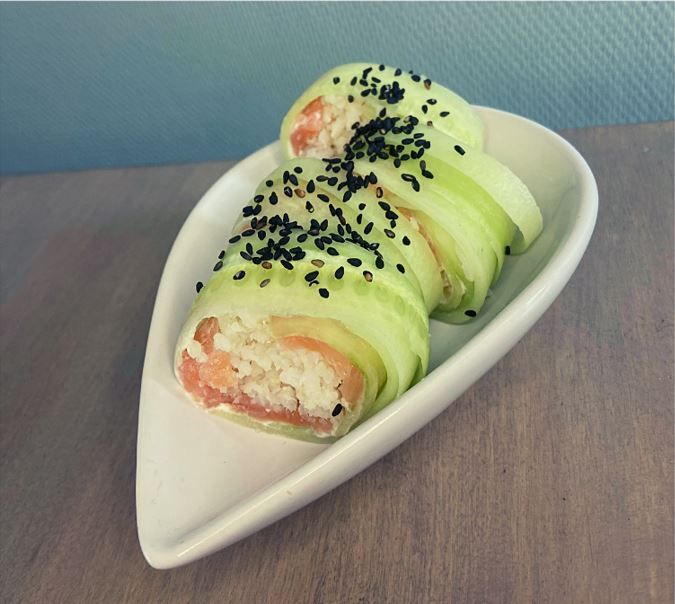 - Leg de rijst in een langwerpig hoopje op de zalmplakjes en rol de komkommerplakjes op zodat het een langvormige rol wordt.