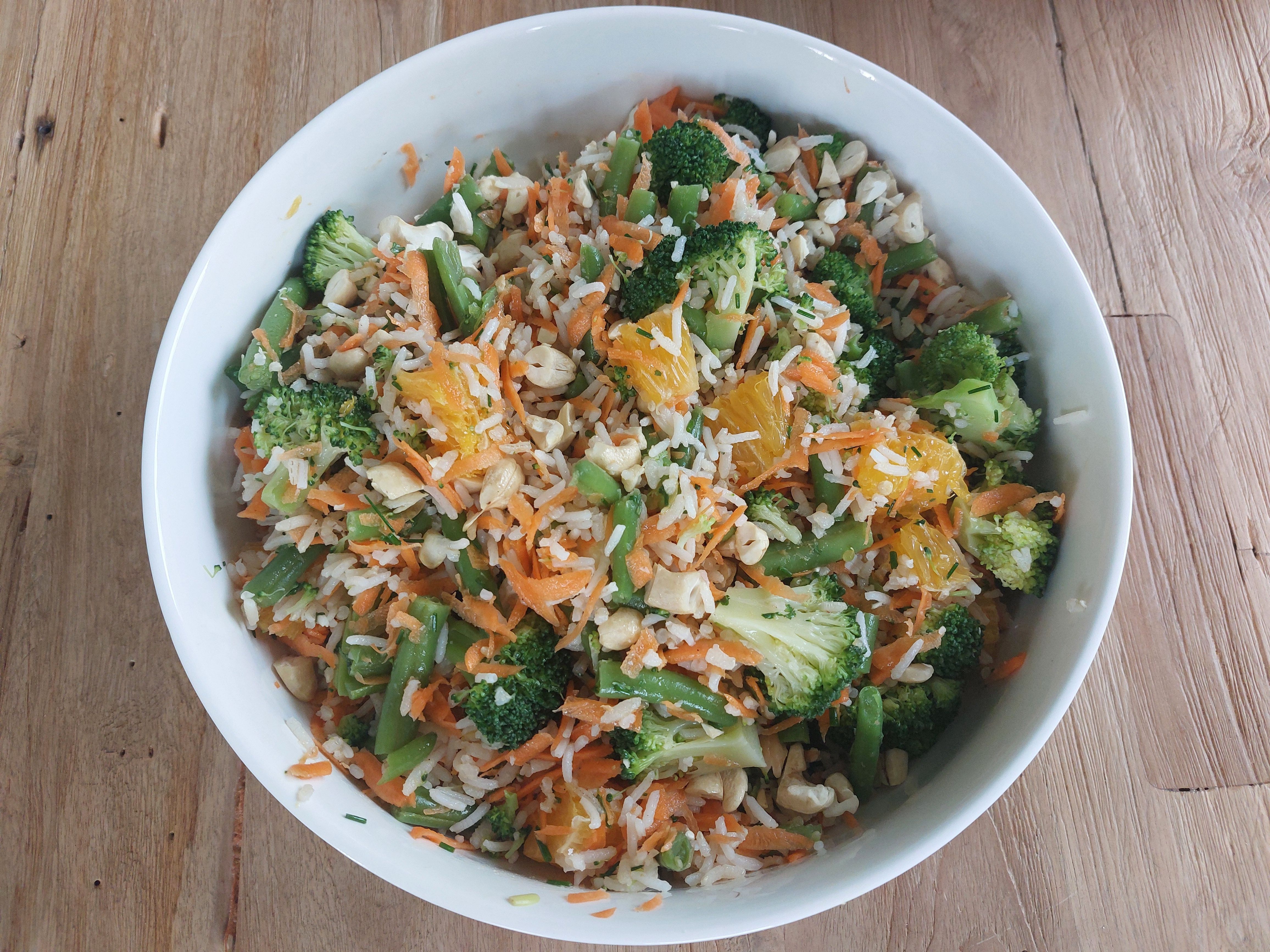 Rijstsalade met groenten, sinaasappel en cashewnoten