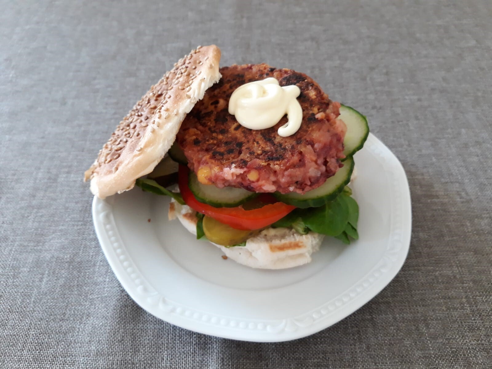 - Beleg een (hamburger)broodje met de burger, sla, paprika, tomaat, komkommer, augurk en een beetje mayonaise naar smaak.
