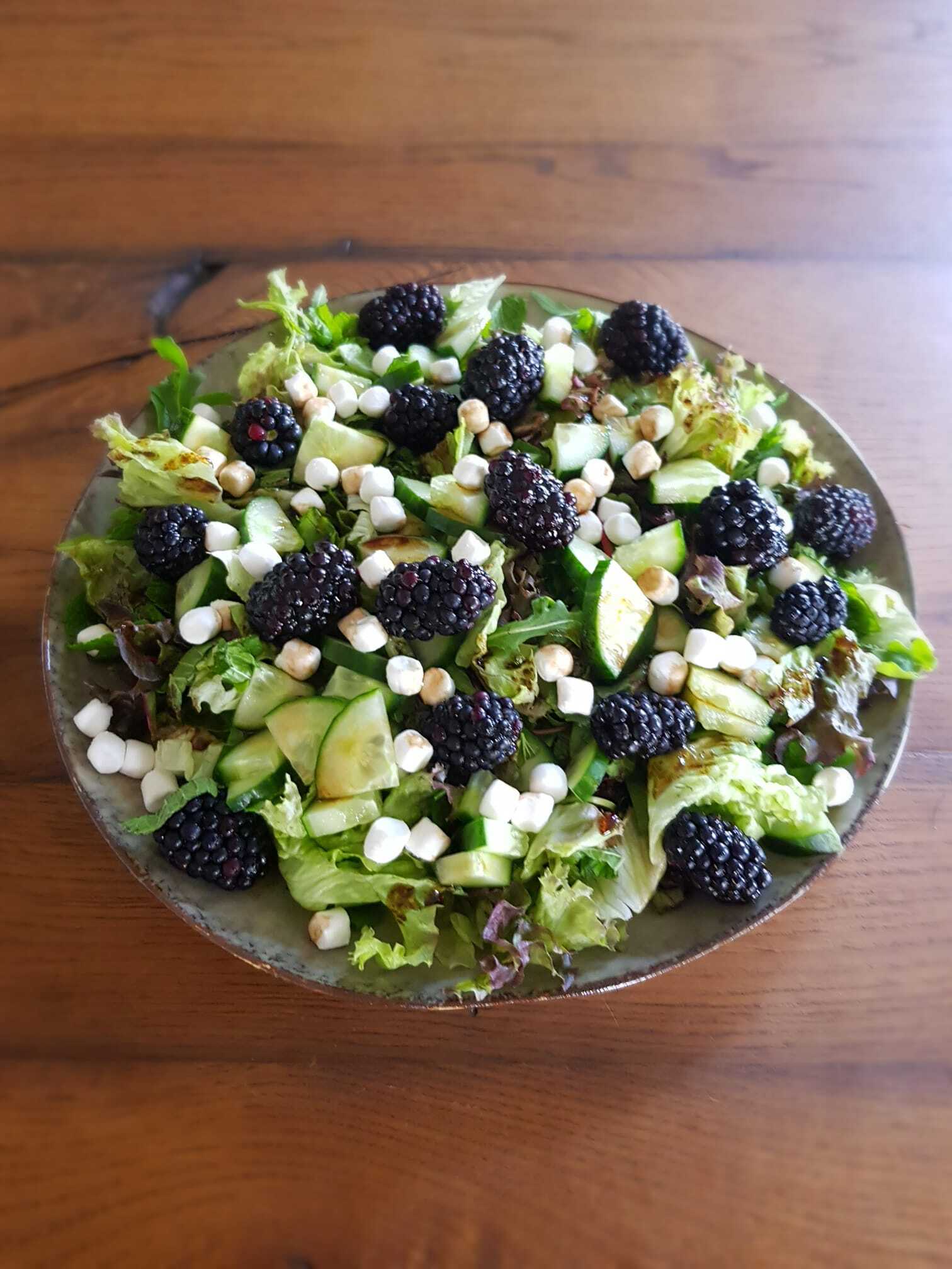 - Was en snijd de komkommer in stukjes en verdeel over de sla.