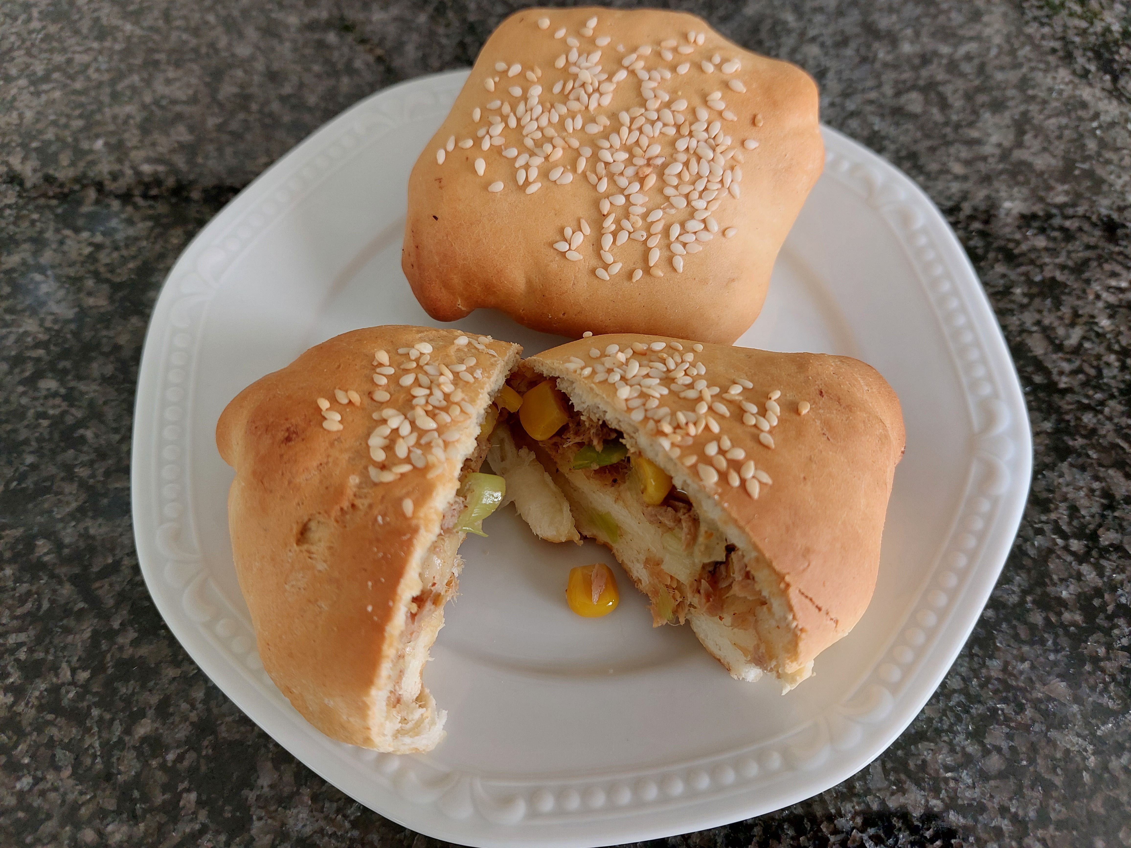 Rol elk balletje uit tot een rondje van 10 cm, schep de tonijnvulling erin en vouw het deeg eromheen tot een bolletje.