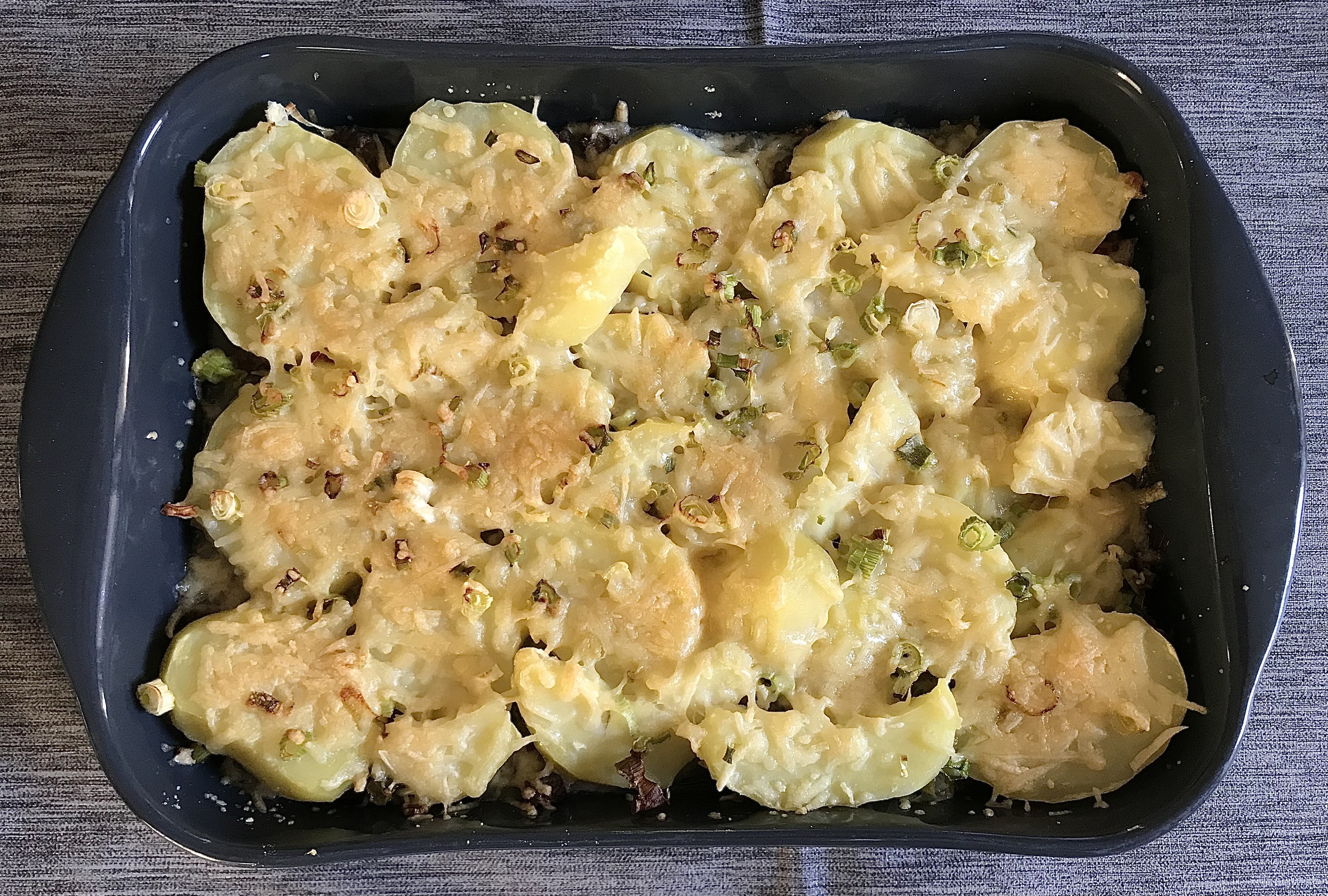- Schil de aardappelen, snijd deze in plakjes en kook de aardappelen gaar.