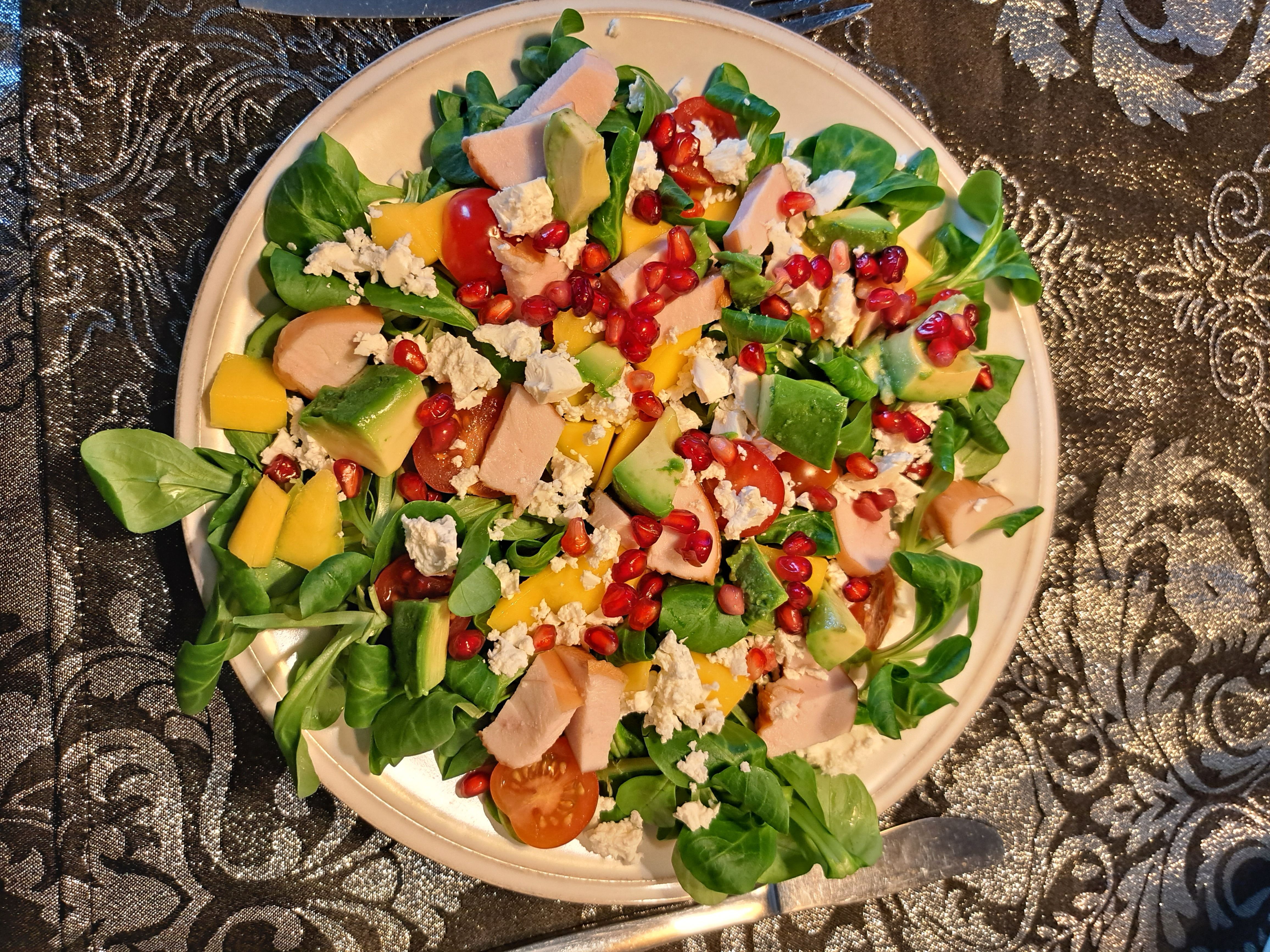 - Schil de mango, en snijd in stukjes en verdeel over de sla.