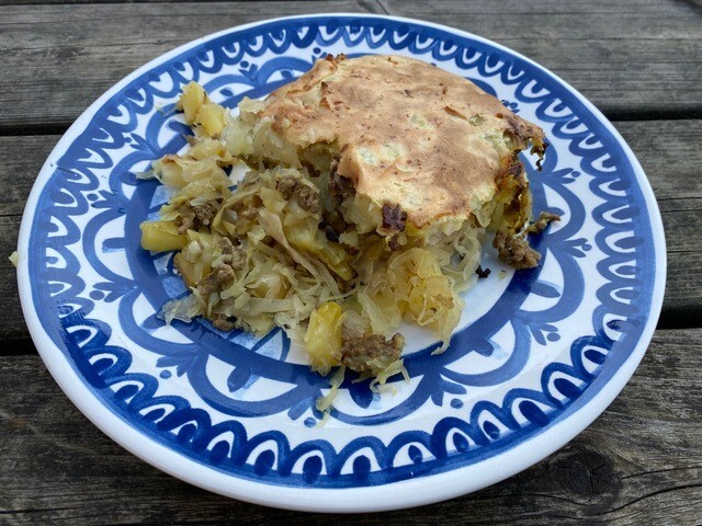 - Doe de zuurkool in een ovenvaste schaal. Schep het gehakt op de zuurkool en dek dit af met de aardappelpuree.
